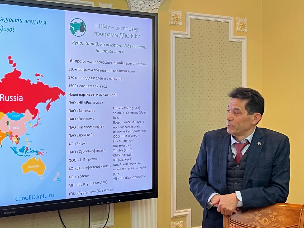 Началось мероприятие с презентации Д.Нургалиевым КФУ и ИГиНГТ. Рассказывая об институте, он акцентировал внимание на программах подготовки. Проректор отметил, что большая часть магистрантов и аспирантов получает практический опыт, работая во время обучения в проектах, которых реализуется более 200.