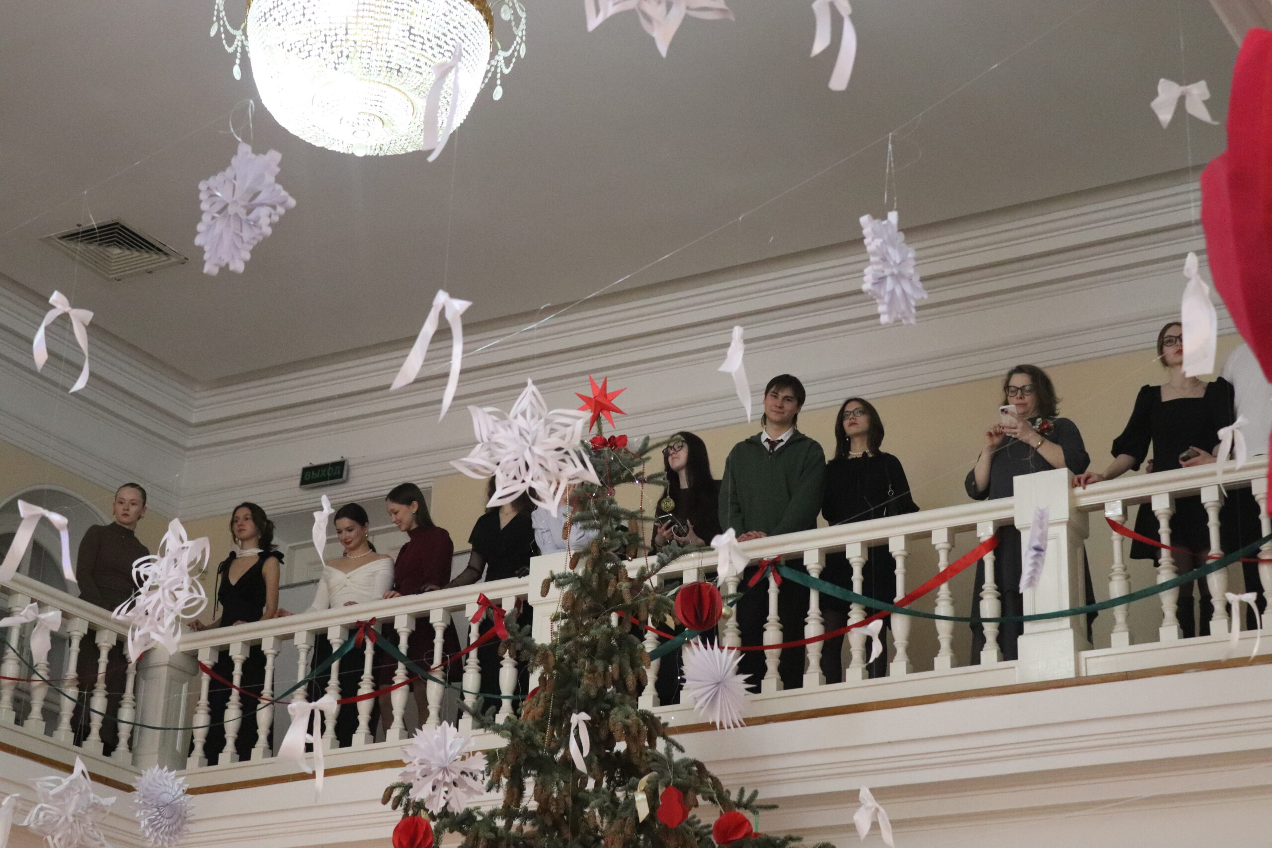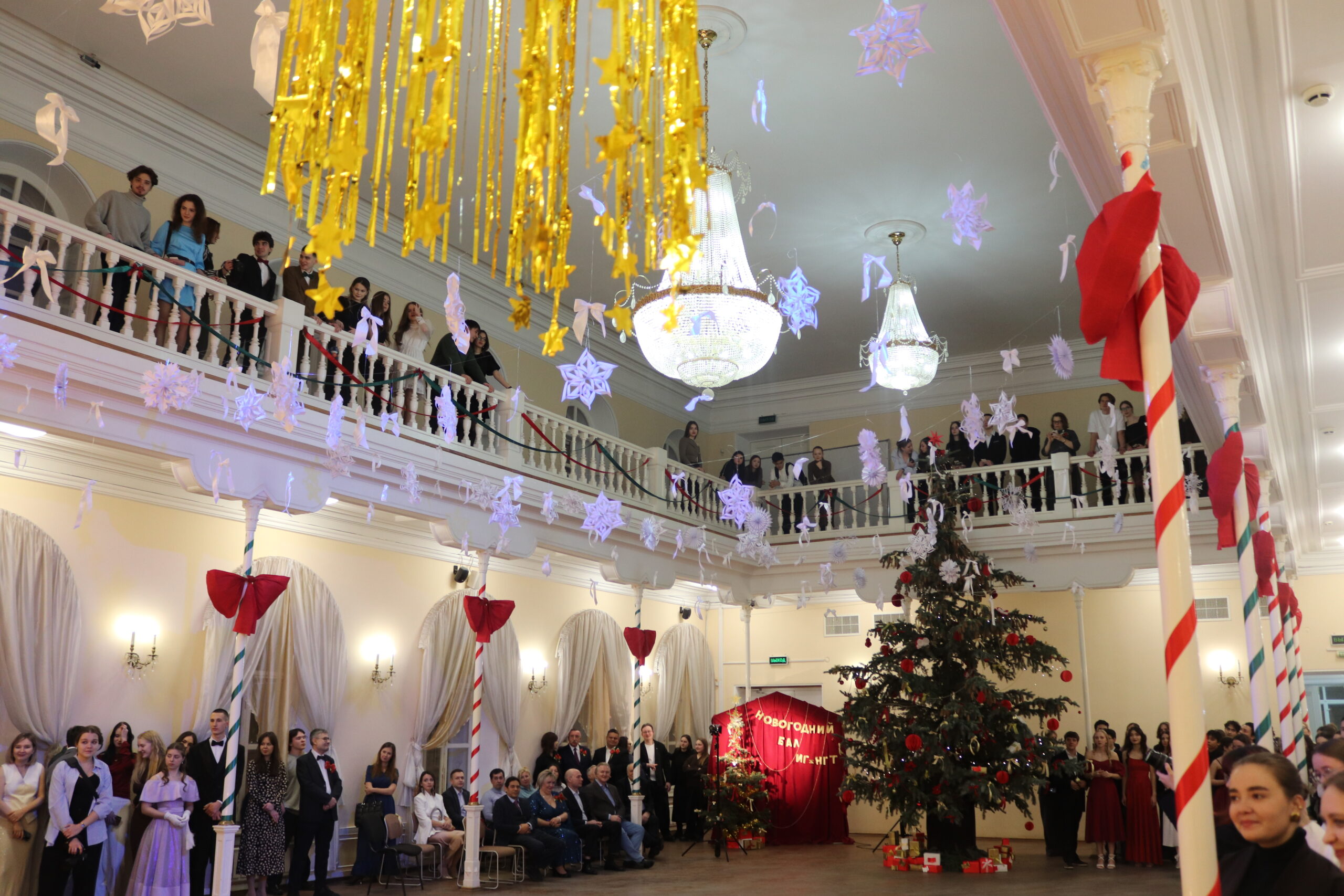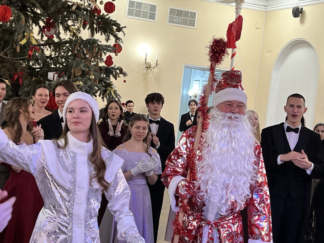Первый новогодний бал в КФУ: вальсирующие пары, Дед Мороз, Снегурочка и живая ель