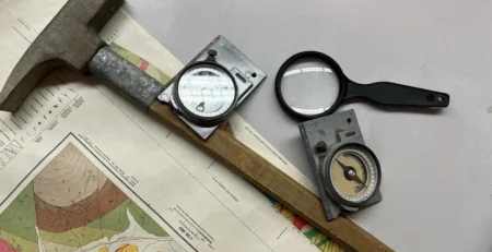 «Главный инструмент геолога – это, конечно, геологический молоток. Он нужен, чтобы отколоть горную породу. Вторая вещь, без которой не обойтись, полевой дневник или полевая книжка. Разумеется, нужен компас – это третья вещь. Четвертая – карта (топографическая основа), куда выносятся точки наблюдения и отрисовываются геологические тела. Конечно, сейчас используются различные гаджеты, в том числе GPS-навигаторы, планшеты. На планшете можно и с картой работать, и дневник вести, но для подстраховки все равно нужны обычный бумажный полевой дневник и компас, который надежнее, а иногда и точнее современных приборов и гаджетов. Кроме того, многими электронными устройствами замерить элементы положения геологических тел вы не сможете. Для этого необходимо специальным образом использовать компас. Поскольку геолог должен наблюдать, записывать, зарисовывать, нужен карандаш, и это пятый предмет. Авторучки мы не используем, потому что, если дневник упадет в воду, то чернила тут же растворятся, и записи исчезнут. Написанное карандашом сохранится. Транспортир нужен для работы с картой, отрисовки элементов залеганий тел и многого другого. Это шестая необходимая вещь. Если работа планируется на россыпных месторождениях, то нужна лопата или кайло. Это седьмая вещь. Рюкзак для хранения образцов – это восемь. Девять – это хорошая обувь, поскольку приходится много ходить и лучше всего для этого подходят сапоги».