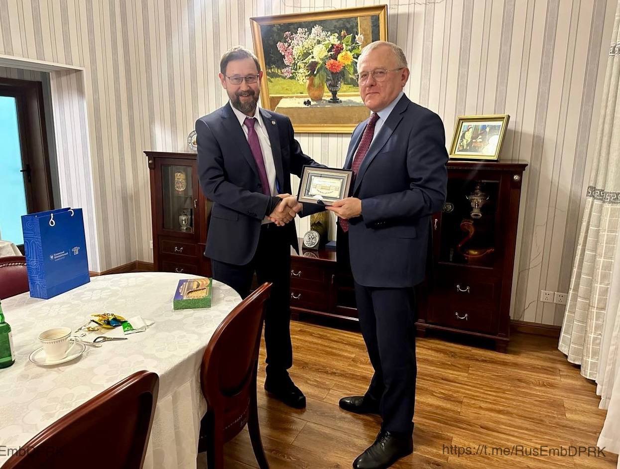 «В ходе нее обсуждалось сотрудничество России и КНДР. В частности, были рассмотрены вопросы согласования действий КФУ и других организаций в области геологического изучения территории КНДР», – сказал Данис Нургалиев, который на встрече вручил послу памятный знак КФУ.