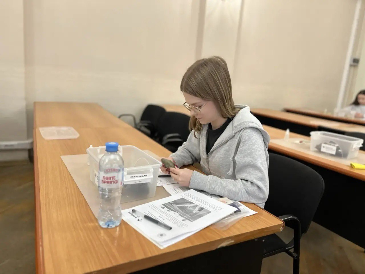 Практическое задание вызвало особый интерес у многих школьников. Им необходимо было определить горные породы и палеонтологические образцы, которые были предоставлены кафедрой минералогии и литологии, кафедрой общей геологии и гидрогеологии, а также Геологическим музеем им. А.А.Штукенберга КФУ.